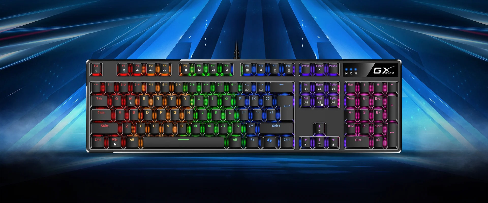 Bàn phím cơ Genius Scorpion K12 được trang bị hệ thống đèn nền RGB, giúp các phím luôn hiển thị rõ ràng ngay cả khi sử dụng vào ban đêm.