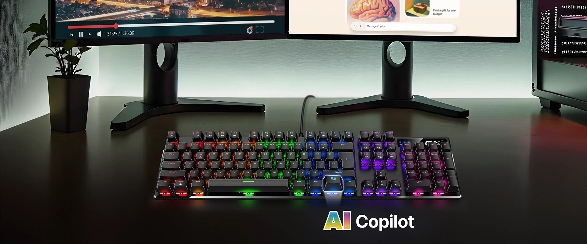 Bàn phím được trang bị đèn nền RGB, giúp các phím hiển thị rõ ràng trong điều kiện thiếu sáng, đồng thời tạo điểm nhấn cho góc làm việc hoặc góc gaming.