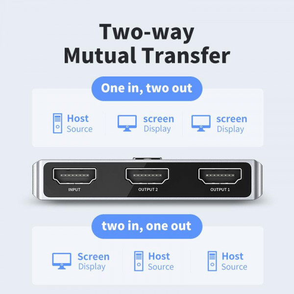 Switch HDMI hai chiều Jasoz T-G175 hỗ trợ 1 vào 2 ra hoặc 2 vào 1 ra, độ phân giải lên đến 8K/60Hz và 4K/60Hz. Trang bị 3 cổng HDMI 2.0, điều khiển từ xa tiện lợi, hỗ trợ âm thanh HDR, 3D, DTS, Dolby, cắm là chạy, phù hợp cho văn phòng và phòng chiếu phim. ( Lưu ý không hỗ trợ 2 màn hình song song )