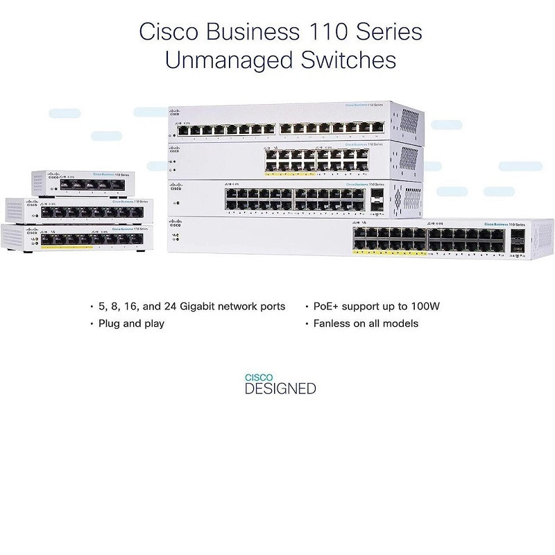 Cisco CBS110 là dòng switch unmanaged, chỉ cần cắm là chạy, không cần cấu hình phức tạp, phù hợp cho người dùng phổ thông và doanh nghiệp nhỏ.